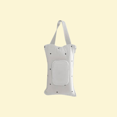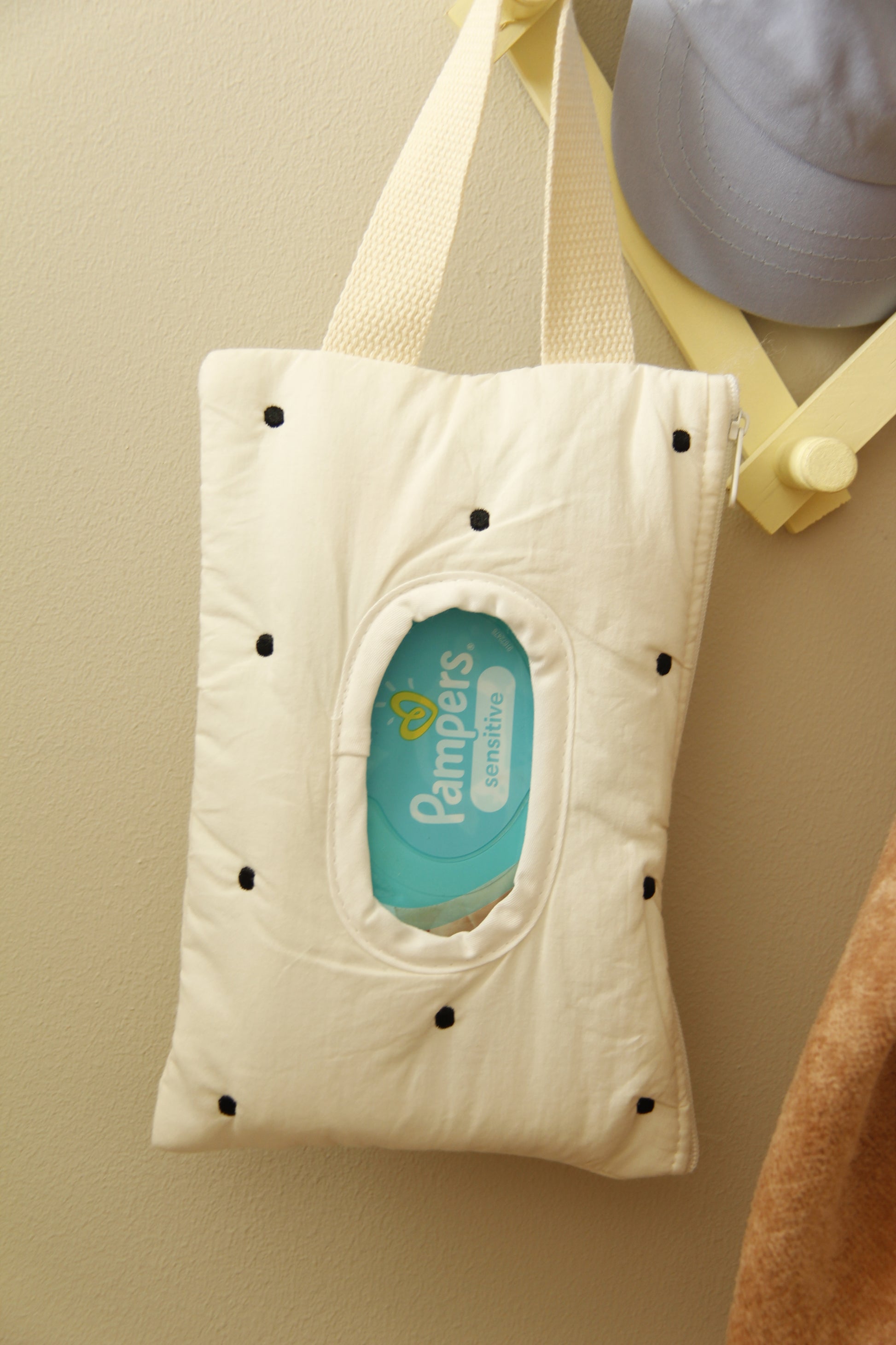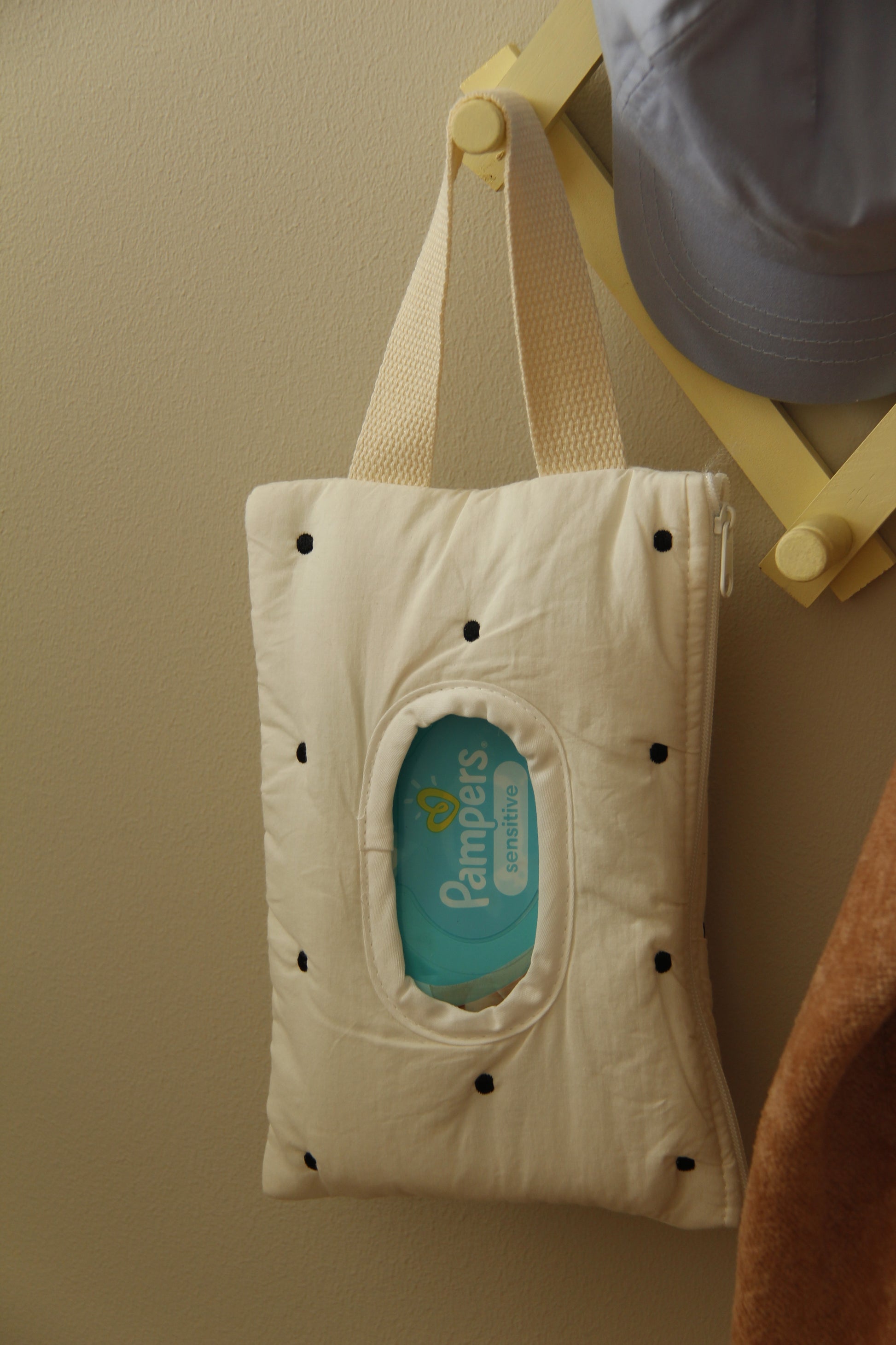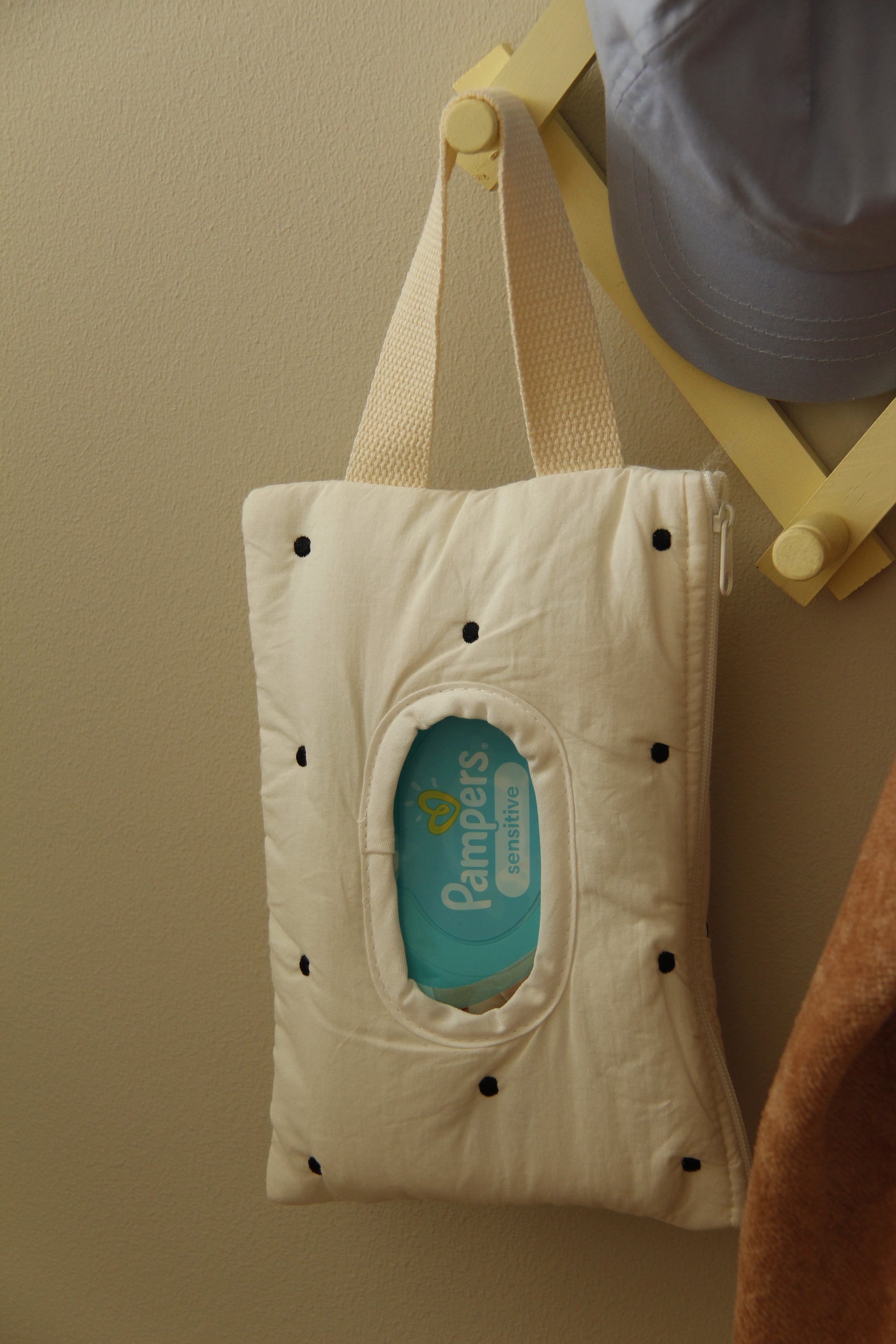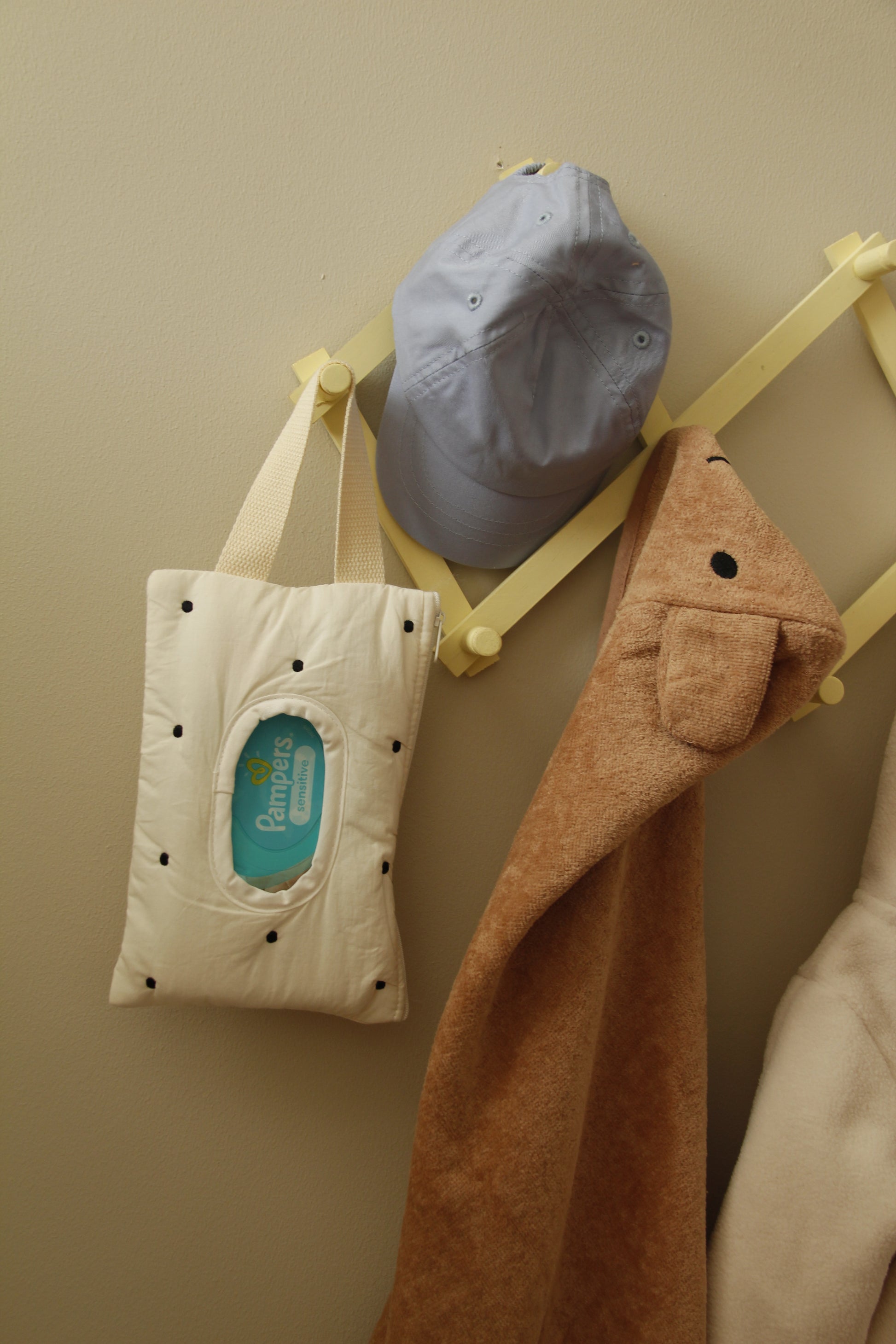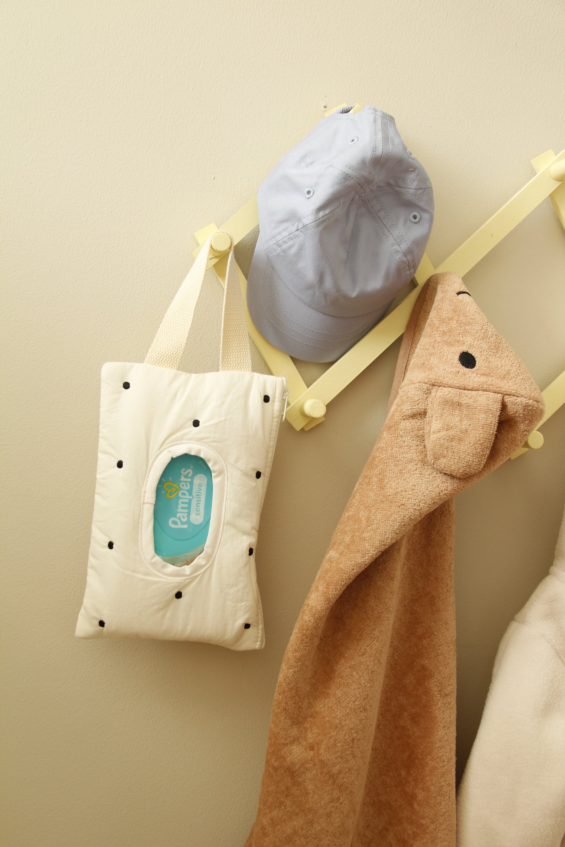 Vind jij die billendoekjes-verpakkingen ook zo lelijk? Dan is dit schattige polkadot opbergzakje iets voor jou! Dankzij het slimme design en de stevige lus hang je hem eenvoudig aan de box, commode of kinderwagen. De opening aan de voorkant zorgt ervoor dat je snel een doekje kunt pakken, terwijl het zachte katoen een luxe uitstraling geeft.
